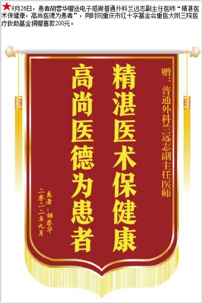 患者胡蓉华赠送电子感谢普通外科兰远志副主任医师,并向医疗救助基金捐赠善款200元-锦旗-患者心声-患者服务-重庆医科大学附属第三医院【官方网站】
