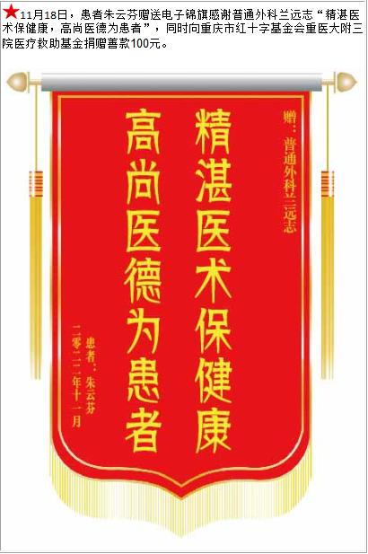 患者朱云芬赠送电子锦旗感谢普通外科兰远志,并向医疗救助基金捐赠善款100元-锦旗-患者心声-患者服务-重庆医科大学附属第三医院【官方网站】