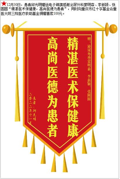 患者邱光明赠送电子锦旗感谢泌尿外科蒙明森等人,并向医疗救助基金捐赠善款100元-锦旗-患者心声-患者服务-重庆医科大学附属第三医院【官方网站】