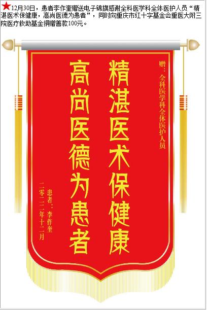 患者李作奎赠送电子锦旗感谢全科医学科全体医护人员,并向医疗救助基金捐赠善款100元
