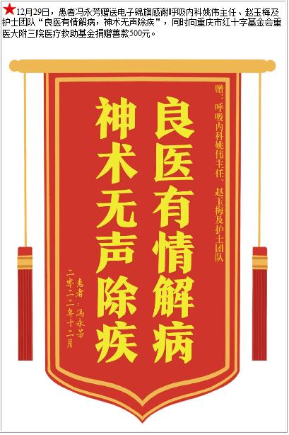 患者冯永芳赠送电子锦旗感谢呼吸内科姚伟主任等人及护士团队,并向医疗救助基金捐赠善款500元-锦旗-患者心声-患者服务-重庆医科大学附属第三医院【官方网站】