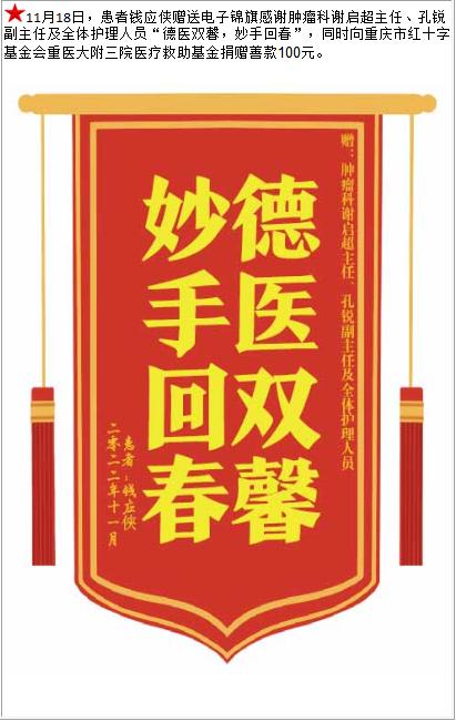 患者钱应侠赠送电子锦旗感谢肿瘤科谢启超主任等人及全体护理人员,并向医疗救助基金捐赠善款100元