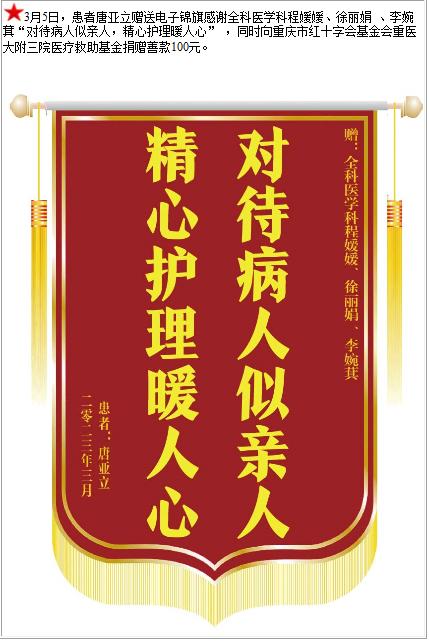 患者唐亚立赠送电子锦旗感谢全科医学科程媛媛等人,并向医疗救助基金捐赠善款100元-锦旗-患者心声-患者服务-重庆医科大学附属第三医院【官方网站】