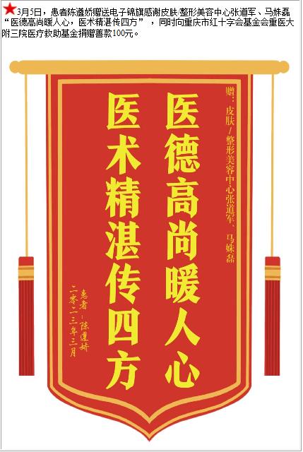 患者陈遵娇赠送电子锦旗感谢皮肤/整形美容中心张道军等人,并向医疗救助基金捐赠善款100元-锦旗-患者心声-患者服务-重庆医科大学附属第三医院【官方网站】