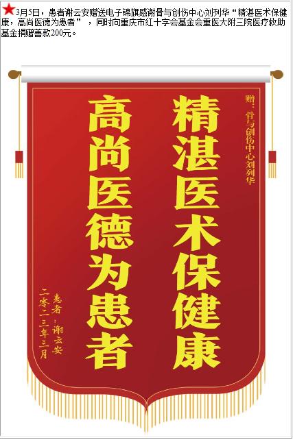 患者谢云安赠送电子锦旗感谢骨与创伤中心刘列华 ,并向医疗救助基金捐赠善款200元-锦旗-患者心声-患者服务-重庆医科大学附属第三医院【官方网站】