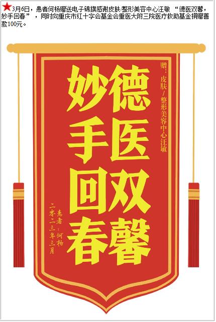 患者何杨赠送电子锦旗感谢皮肤/整形美容中心汪敏,并向医疗救助基金捐赠善款100元-锦旗-患者心声-患者服务-重庆医科大学附属第三医院【官方网站】