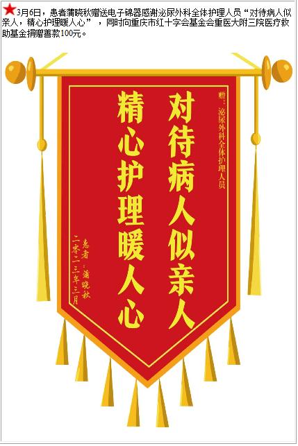 患者蒲晓秋赠送电子锦器感谢泌尿外科全体护理人员,并向医疗救助基金捐赠善款100元-锦旗-患者心声-患者服务-重庆医科大学附属第三医院【官方网站】
