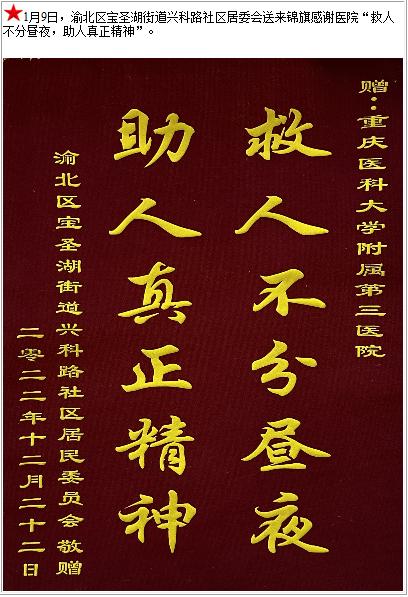 渝北区宝圣湖街道兴科路社区居委会送来锦旗感谢医院“救人不分昼夜,助人真正精神”-锦旗-患者心声-患者服务-重庆医科大学附属第三医院【官方网站】