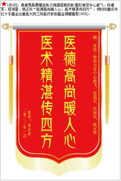 患者易昌勇赠送电子锦旗感谢皮肤/整形美容中心郝飞主任等人,并向医疗救助基金捐赠善款100元-锦旗-患者心声-患者服务-重庆医科大学附属第三医院【官方网站】