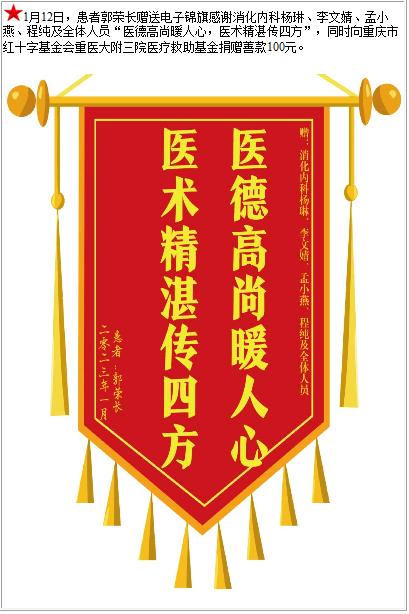 患者郭荣长赠送电子锦旗感谢消化内科杨琳等人及全体人员,并向医疗救助基金捐赠善款100元-锦旗-患者心声-患者服务-重庆医科大学附属第三医院【官方网站】