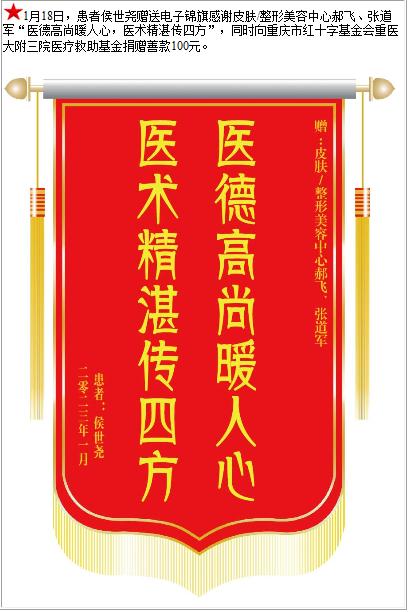 患者侯世尧赠送电子锦旗感谢皮肤/整形美容中心郝飞等人,并向医疗救助基金捐赠善款100元-锦旗-患者心声-患者服务-重庆医科大学附属第三医院【官方网站】