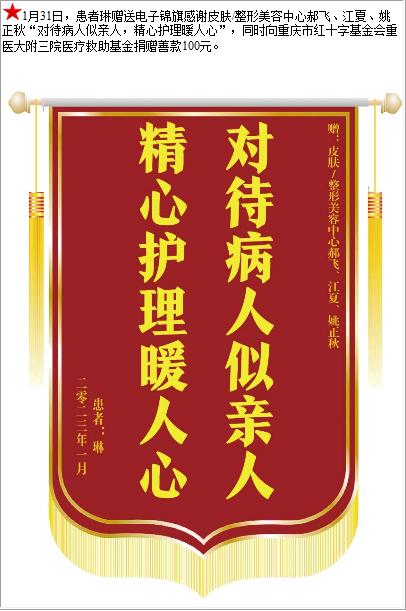 患者琳赠送电子锦旗感谢皮肤/整形美容中心郝飞等人,并向医疗救助基金捐赠善款100元-锦旗-患者心声-患者服务-重庆医科大学附属第三医院【官方网站】