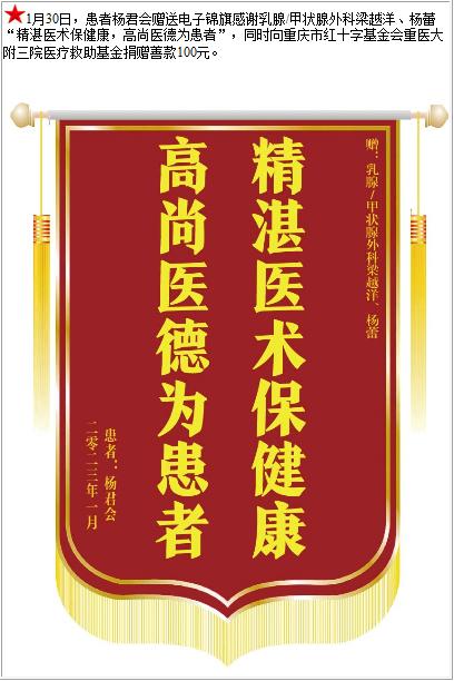 患者杨君会赠送电子锦旗感谢乳腺/甲状腺外科梁越洋等人,并向医疗救助基金捐赠善款100元-锦旗-患者心声-患者服务-重庆医科大学附属第三医院【官方网站】