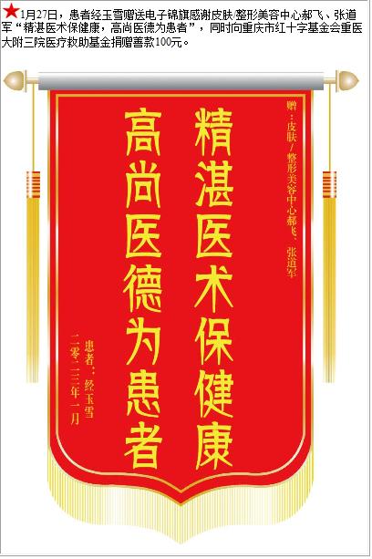 患者经玉雪赠送电子锦旗感谢皮肤/整形美容中心郝飞等人,并向医疗救助基金捐赠善款100元-锦旗-患者心声-患者服务-重庆医科大学附属第三医院【官方网站】