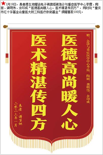 患者傅生地赠送电子锦旗感谢急诊与重症医学中心李霞等人,并向医疗救助基金捐赠善款100元-锦旗-患者心声-患者服务-重庆医科大学附属第三医院【官方网站】