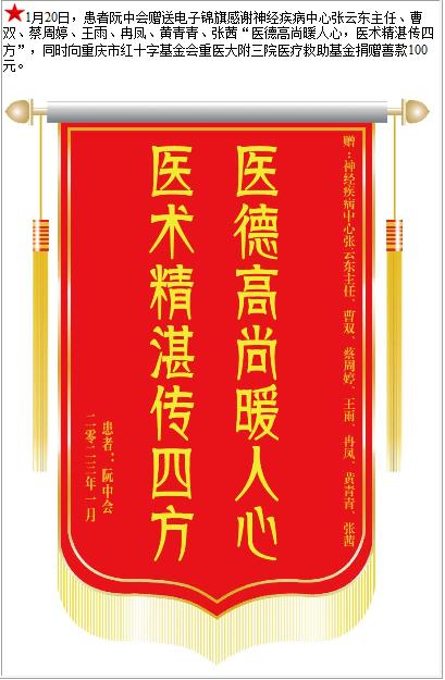患者阮中会赠送电子锦旗感谢神经疾病中心张云东主任等人,并向医疗救助基金捐赠善款100元-锦旗-患者心声-患者服务-重庆医科大学附属第三医院【官方网站】