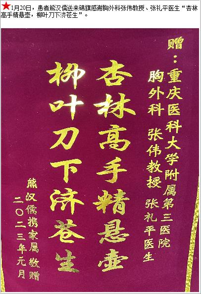 患者熊汉儒送来锦旗感谢胸外科张伟教授、张礼平医生“杏林高手精悬壶,柳叶刀下济苍生”-锦旗-患者心声-患者服务-重庆医科大学附属第三医院【官方网站】