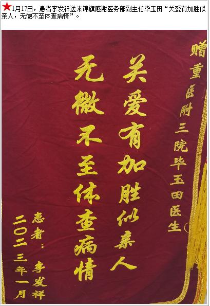 患者李发祥送来锦旗感谢医务部副主任毕玉田“关爱有加胜似亲人,无微不至体查病情”-锦旗-患者心声-患者服务-重庆医科大学附属第三医院【官方网站】