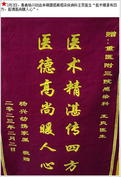患者杨兴幼送来锦旗感谢感染疾病科王爽医生“医术精湛传四方,医德高尚暖人心”-锦旗-患者心声-患者服务-重庆医科大学附属第三医院【官方网站】