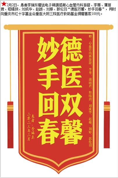 患者李瑞东赠送电子锦旗感谢心血管内科游甜等人,并向医疗救助基金捐赠善款100元-锦旗-患者心声-患者服务-重庆医科大学附属第三医院【官方网站】