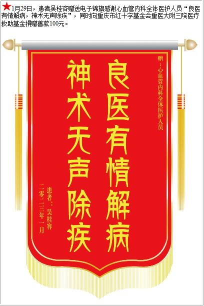 患者吴桂容赠送电子锦旗感谢心血管内科全体医护人员,并向医疗救助基金捐赠善款100元