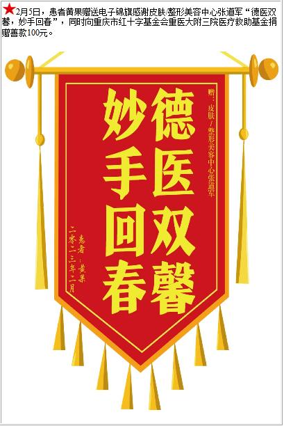 患者黄果赠送电子锦旗感谢皮肤/整形美容中心张道军,并向医疗救助基金捐赠善款100元-锦旗-患者心声-患者服务-重庆医科大学附属第三医院【官方网站】
