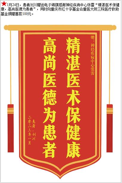 患者刘川赠送电子锦旗感谢神经疾病中心张雷,并向医疗救助基金捐赠善款100元-锦旗-患者心声-患者服务-重庆医科大学附属第三医院【官方网站】