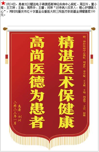 患者刘川赠送电子锦旗感谢神经疾病中心熊虹等人,并向医疗救助基金捐赠善款100元-锦旗-患者心声-患者服务-重庆医科大学附属第三医院【官方网站】