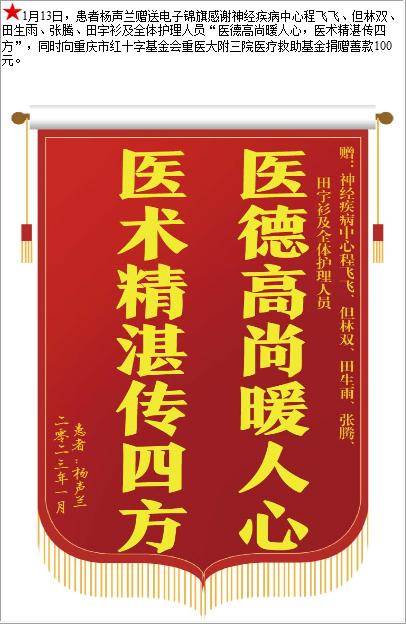 患者杨声兰赠送电子锦旗感谢神经疾病中心程飞飞等人及全体护理人员,并向医疗救助基金捐赠善款100元。-锦旗-患者心声-患者服务-重庆医科大学附属第三医院【官方网站】