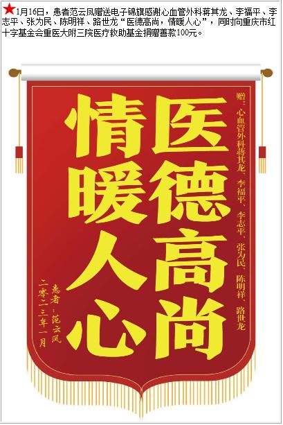 患者范云凤赠送电子锦旗感谢心血管外科蒋其龙等人,并向医疗救助基金捐赠善款100元-锦旗-患者心声-患者服务-重庆医科大学附属第三医院【官方网站】