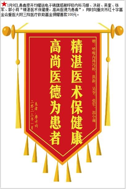 患者廖开均赠送电子锦旗感谢呼吸内科冯婷等人,并向医疗救助基金捐赠善款100元