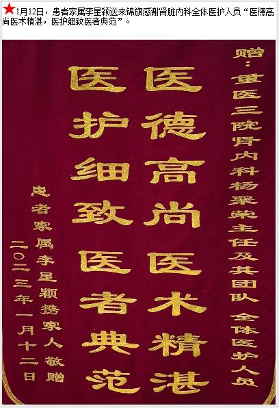 患者家属李星颖送来锦旗感谢肾脏内科全体医护人员“医德高尚医术精湛,医护细致医者典范”-锦旗-患者心声-患者服务-重庆医科大学附属第三医院【官方网站】