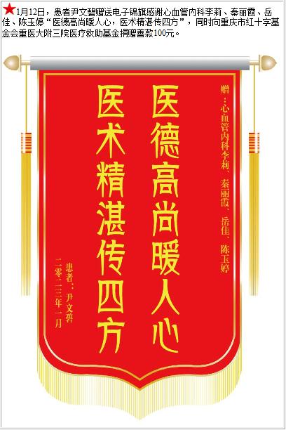 患者尹文碧赠送电子锦旗感谢心血管内科李莉等人,并向医疗救助基金捐赠善款100元-锦旗-患者心声-患者服务-重庆医科大学附属第三医院【官方网站】