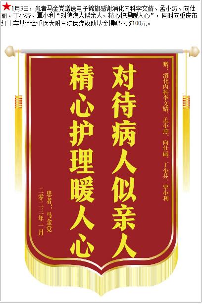 患者马金党赠送电子锦旗感谢消化内科李文婧等人,并向医疗救助基金捐赠善款100元-锦旗-患者心声-患者服务-重庆医科大学附属第三医院【官方网站】
