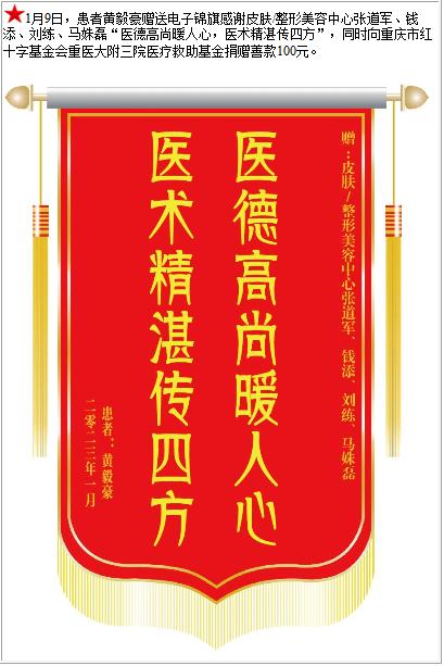 患者黄毅豪赠送电子锦旗感谢皮肤/整形美容中心张道军等人,并向医疗救助基金捐赠善款100元-锦旗-患者心声-患者服务-重庆医科大学附属第三医院【官方网站】