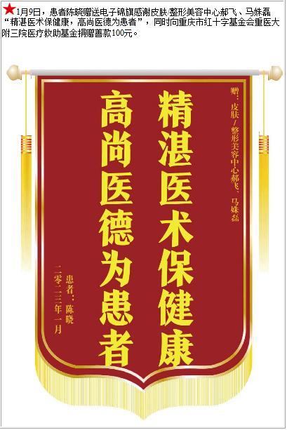 患者陈晓赠送电子锦旗感谢皮肤/整形美容中心郝飞等人,并向医疗救助基金捐赠善款100元-锦旗-患者心声-患者服务-重庆医科大学附属第三医院【官方网站】