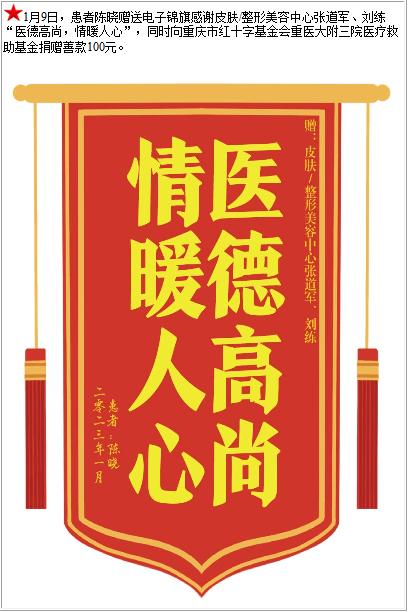 患者陈晓赠送电子锦旗感谢皮肤/整形美容中心张道军等人,并向医疗救助基金捐赠善款100元-锦旗-患者心声-患者服务-重庆医科大学附属第三医院【官方网站】