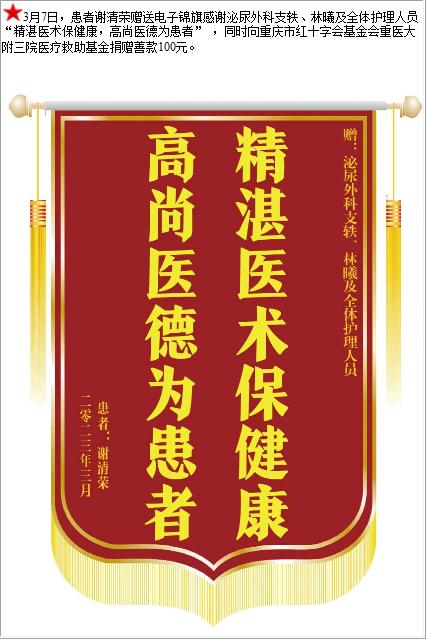 患者谢清荣赠送电子锦旗感谢泌尿外科支轶等人及全体护理人员,并向医疗救助基金捐赠善款100元-锦旗-患者心声-患者服务-重庆医科大学附属第三医院【官方网站】