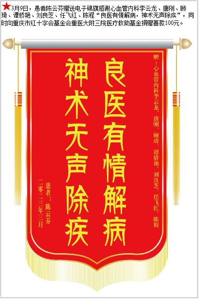 患者陈云芬赠送电子锦旗感谢心血管内科李云龙等人,并向医疗救助基金捐赠善款100元-锦旗-患者心声-患者服务-重庆医科大学附属第三医院【官方网站】