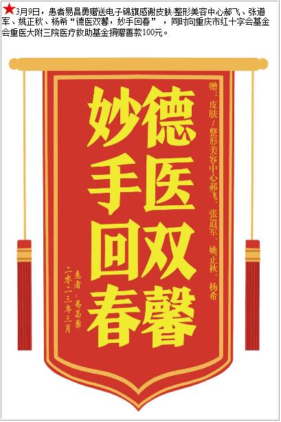 患者易昌勇赠送电子锦旗感谢皮肤/整形美容中心郝飞等人 ,并向医疗救助基金捐赠善款100元-锦旗-患者心声-患者服务-重庆医科大学附属第三医院【官方网站】
