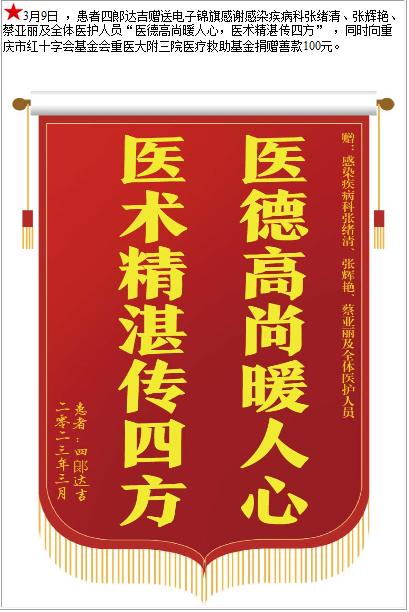 患者四郞达吉赠送电子锦旗感谢感染疾病科张绪清等人及全体医护人员 ,并向医疗救助基金捐赠善款100元-锦旗-患者心声-患者服务-重庆医科大学附属第三医院【官方网站】