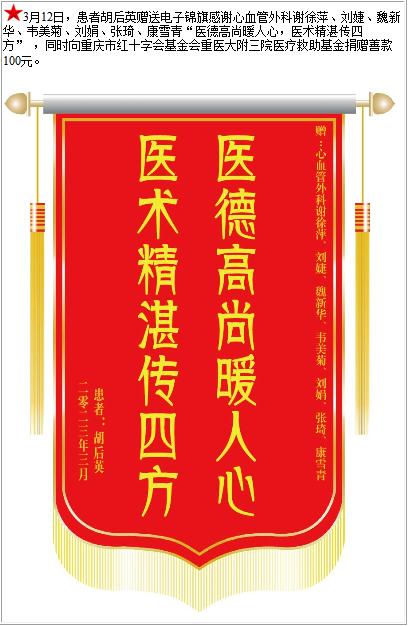 患者胡后英赠送电子锦旗感谢心血管外科谢徐萍等人,并向医疗救助基金捐赠善款100元-锦旗-患者心声-患者服务-重庆医科大学附属第三医院【官方网站】