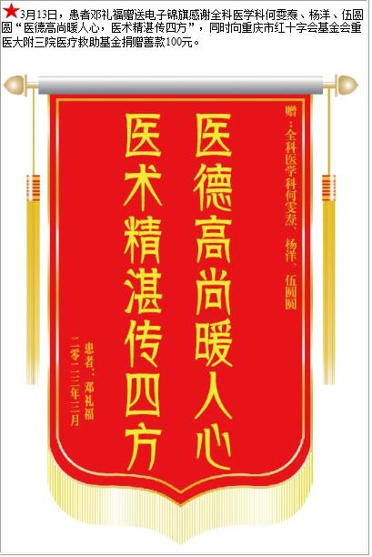 患者邓礼福赠送电子锦旗感谢全科医学科何雯焘等人,并向医疗救助基金捐赠善款100元-锦旗-患者心声-患者服务-重庆医科大学附属第三医院【官方网站】