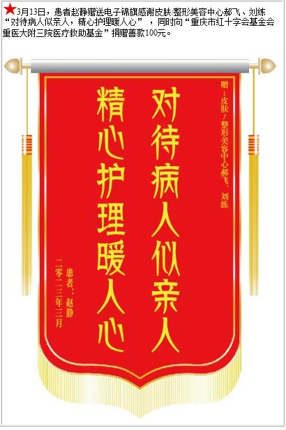 患者赵静赠送电子锦旗感谢皮肤/整形美容中心郝飞等人,并向医疗救助基金捐赠善款100元-锦旗-患者心声-患者服务-重庆医科大学附属第三医院【官方网站】