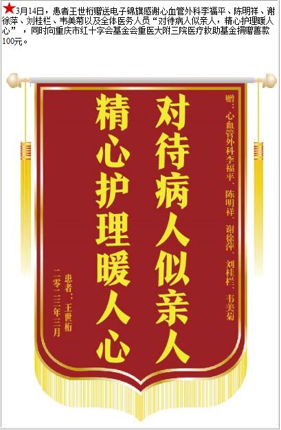 患者王世桁赠送电子锦旗感谢心血管外科李福平等人及全体医务人员,并向医疗救助基金捐赠善款100元-锦旗-患者心声-患者服务-重庆医科大学附属第三医院【官方网站】