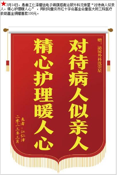 患者江仁泽赠送电子锦旗感谢泌尿外科沈崇星,并向医疗救助基金捐赠善款100元-锦旗-患者心声-患者服务-重庆医科大学附属第三医院【官方网站】