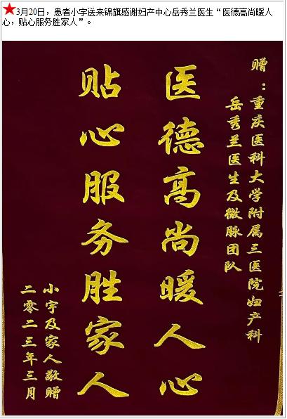 患者小宇送来锦旗感谢妇产中心岳秀兰医生“医德高尚暖人心,贴心服务胜家人”-锦旗-患者心声-患者服务-重庆医科大学附属第三医院【官方网站】
