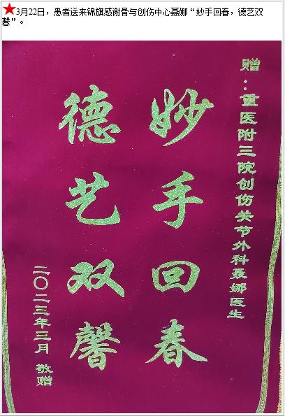 患者送来锦旗感谢骨与创伤中心聂娜“妙手回春,德艺双馨”-锦旗-患者心声-患者服务-重庆医科大学附属第三医院【官方网站】
