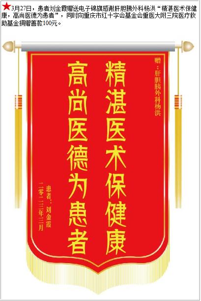 患者刘金霞赠送电子锦旗感谢肝胆胰外科杨洪,并向医疗救助基金捐赠善款100元-锦旗-患者心声-患者服务-重庆医科大学附属第三医院【官方网站】