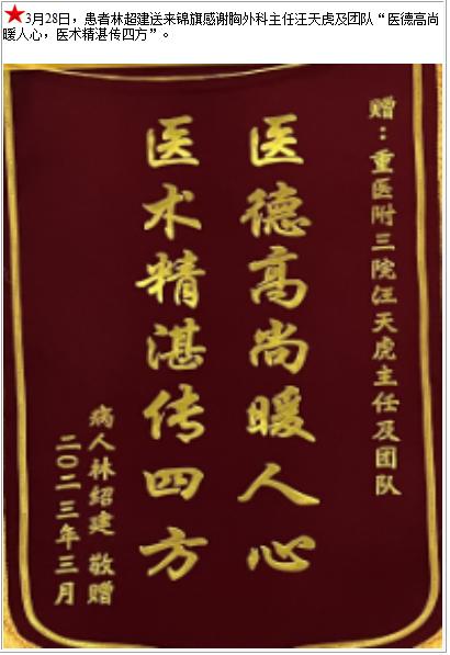 患者林超建送来锦旗感谢胸外科主任汪天虎及团队“医德高尚暖人心,医术精湛传四方”-锦旗-患者心声-患者服务-重庆医科大学附属第三医院【官方网站】